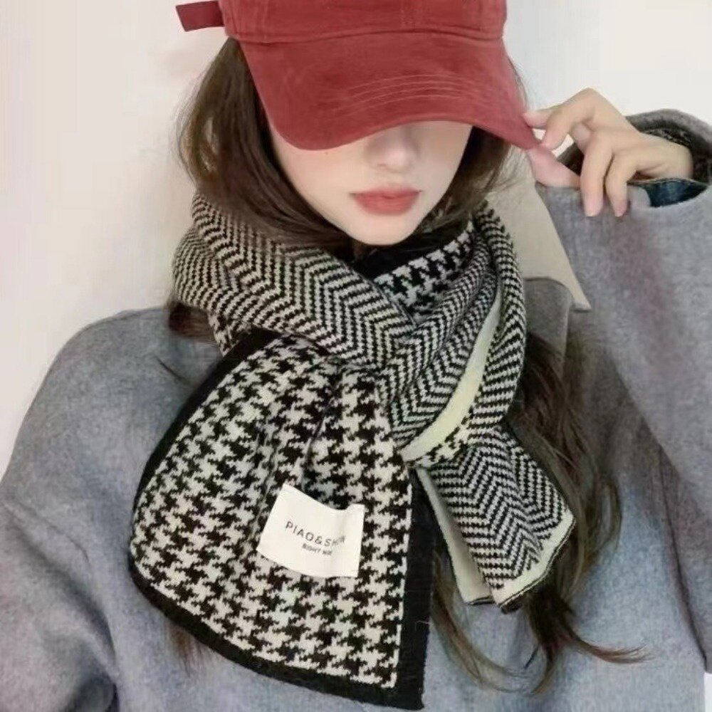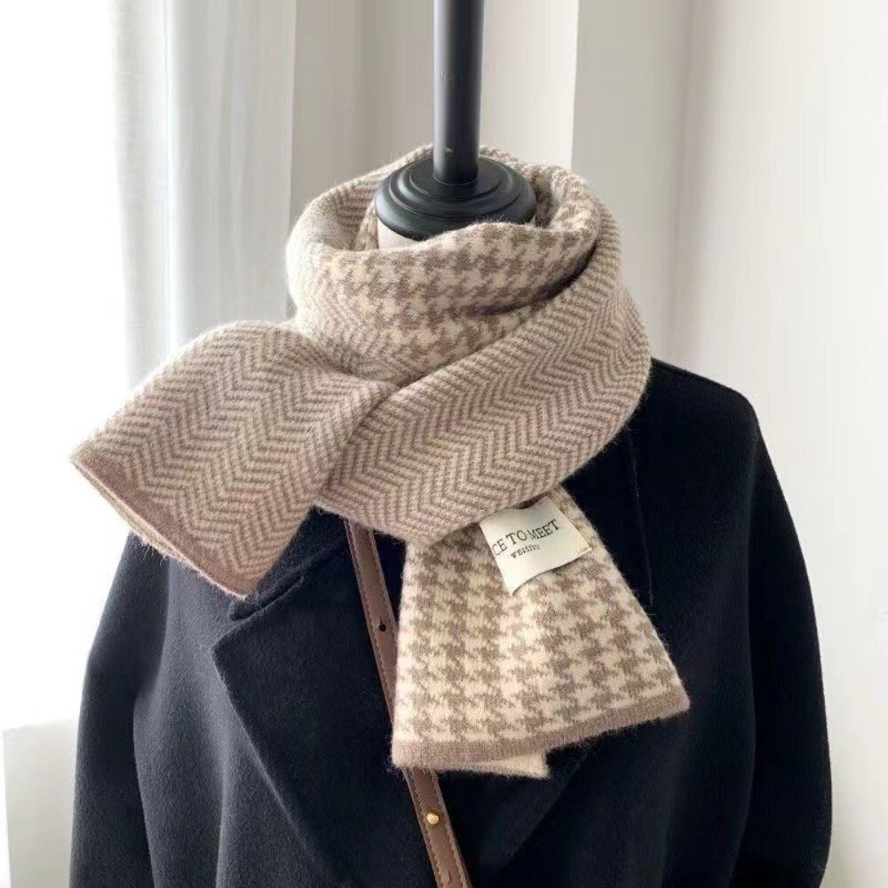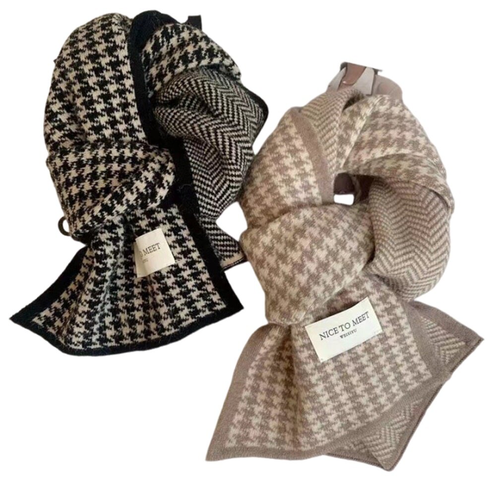 千鳥格針織保暖圍巾 高級感韓系百搭圍脖 情侶針織圍巾 雙面圍巾