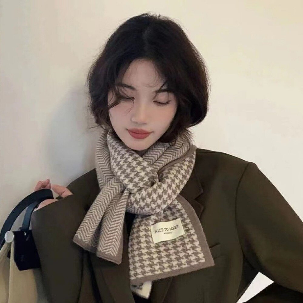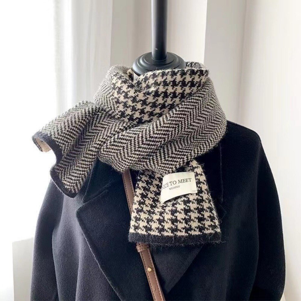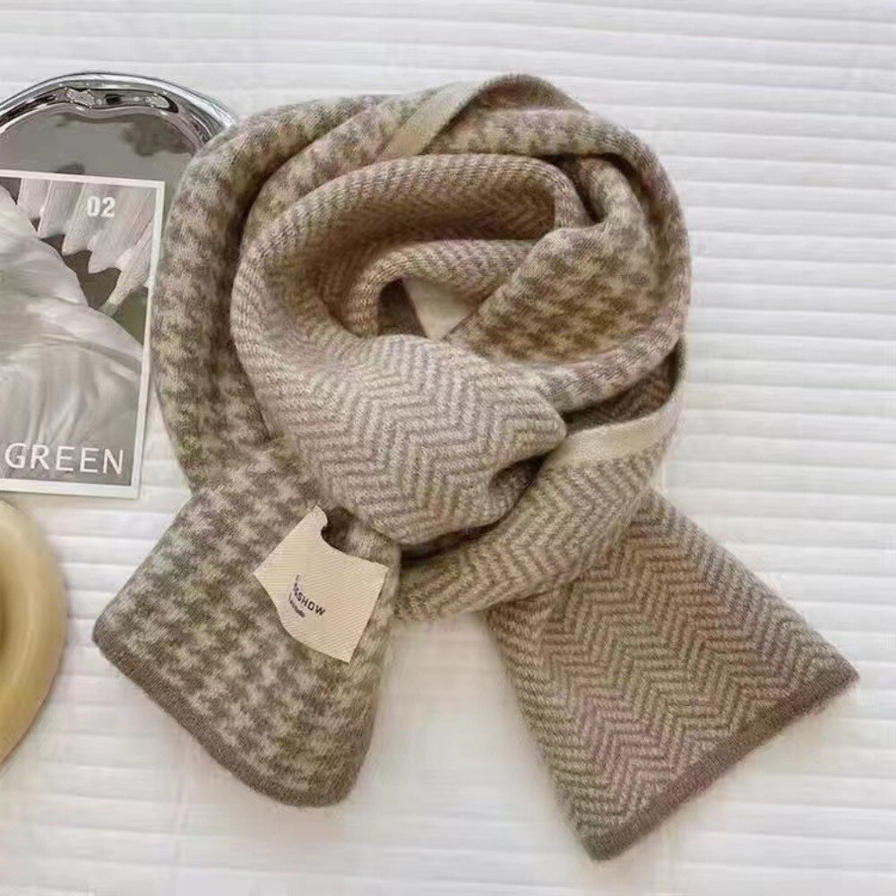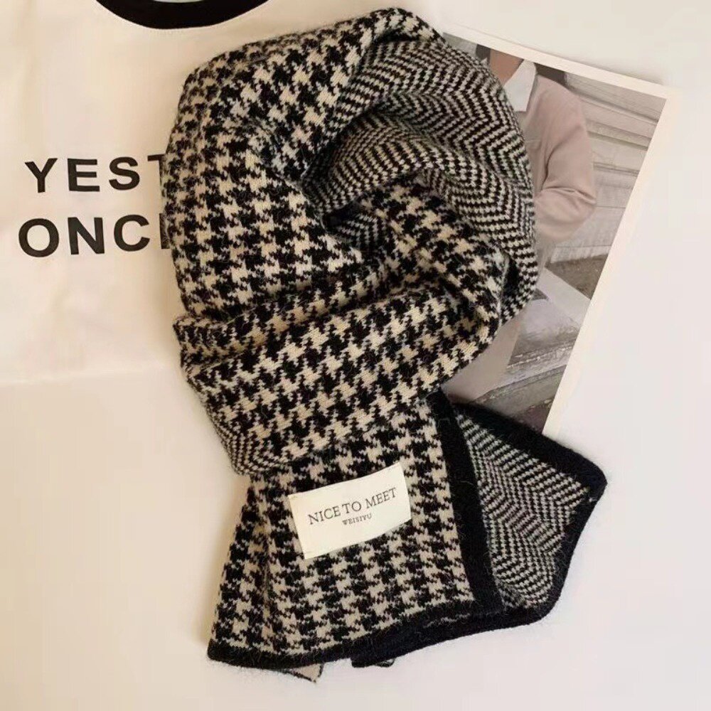 千鳥格針織保暖圍巾 高級感韓系百搭圍脖 情侶針織圍巾 雙面圍巾