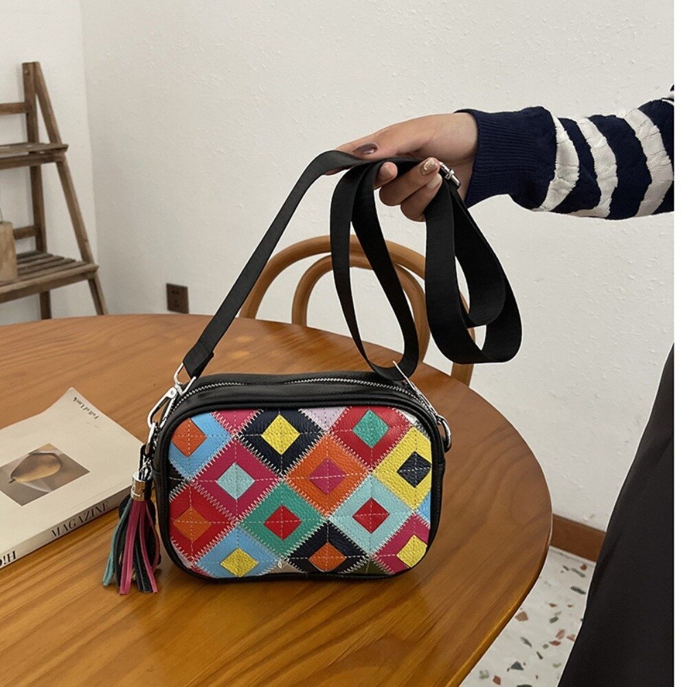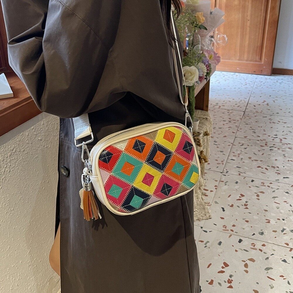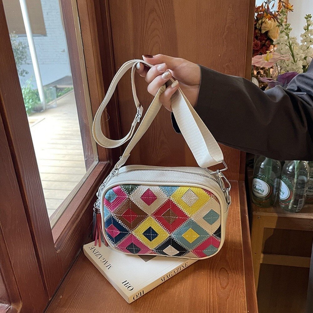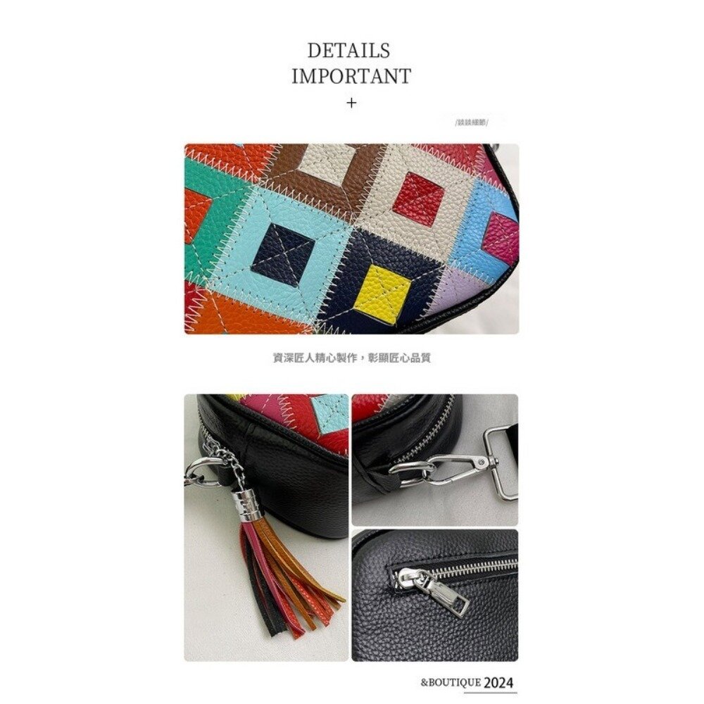 商品名稱:真皮繽紛撞色斜背包 頭層牛皮女包 新款時尚流行 百搭菱格斜挎包 女士撞色單肩包 送禮