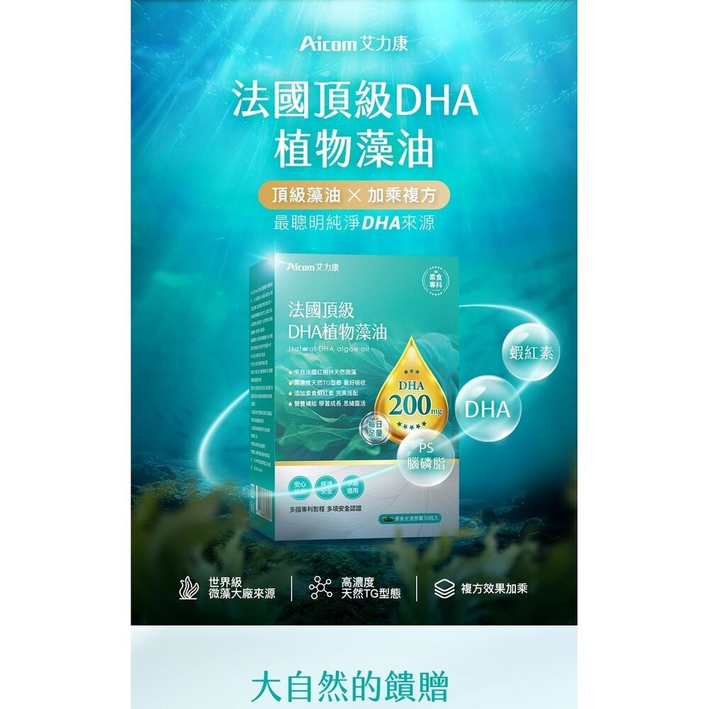 商品名稱:法國頂級DHA植物藻油 植物DHA無異味 適合素食者 孕婦 兒童 銀髮族 Aicom 艾力康 30粒/盒 送禮